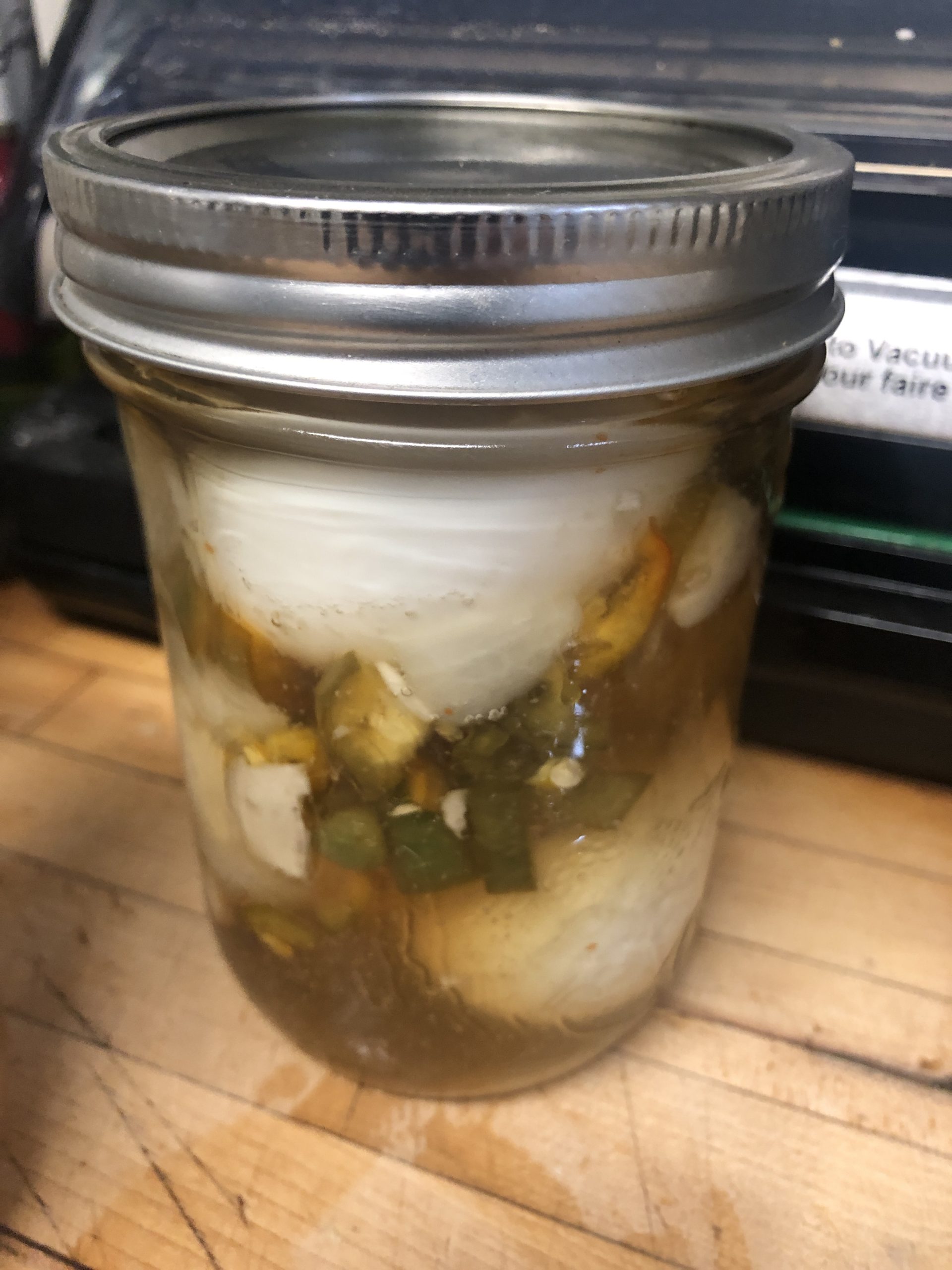 Whip Up the Magic Brine: Toss everything else into a pot: vinegar, sugar, molasses, garlic, cayenne, garlic powder, Death Pepper Mix, onion, and bell pepper. Crank the heat and bring it to a full boil, stirring until the sugar dissolves like it’s surrendering. Drop to a simmer for 5–10 minutes so the flavors mingle, infuse, and get rowdy.