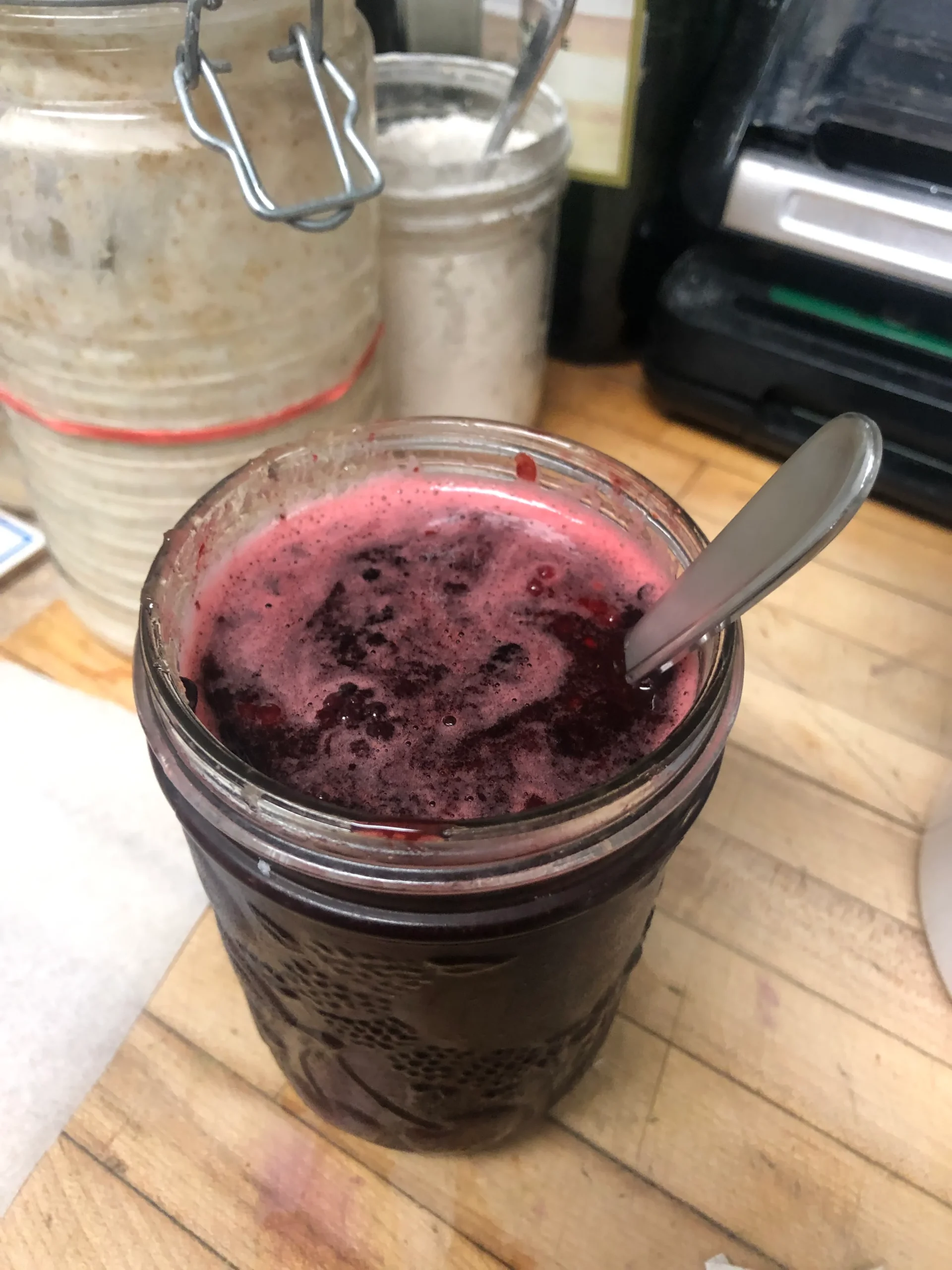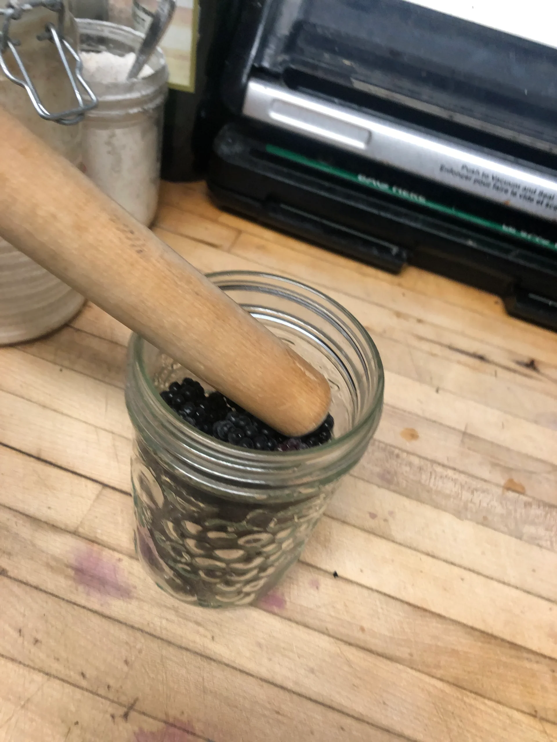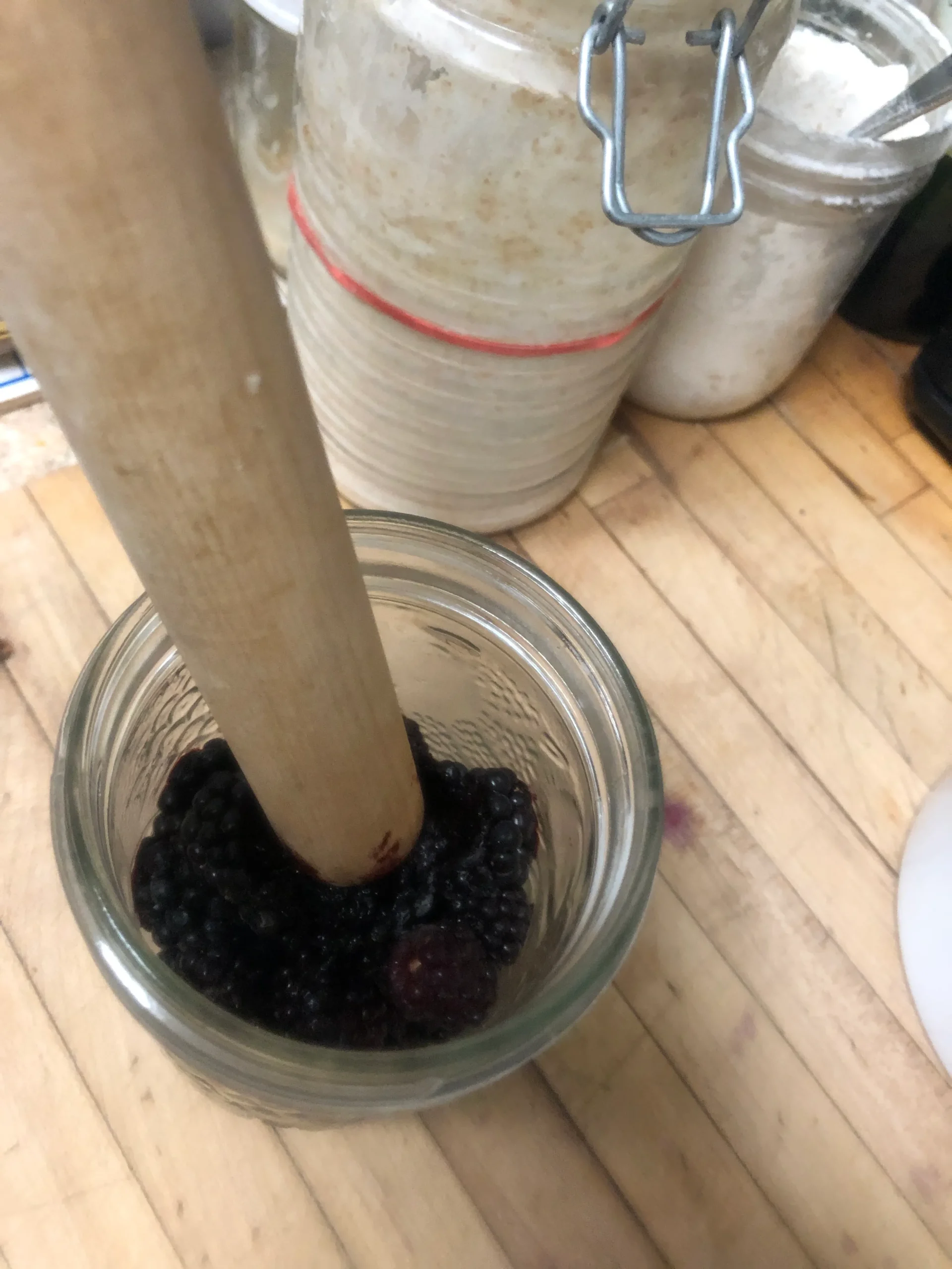 - Fill the jar about 1/3 full with your fruit. If frozen, let it thaw a bit, then smash it down with a wooden spoon to release those juices.